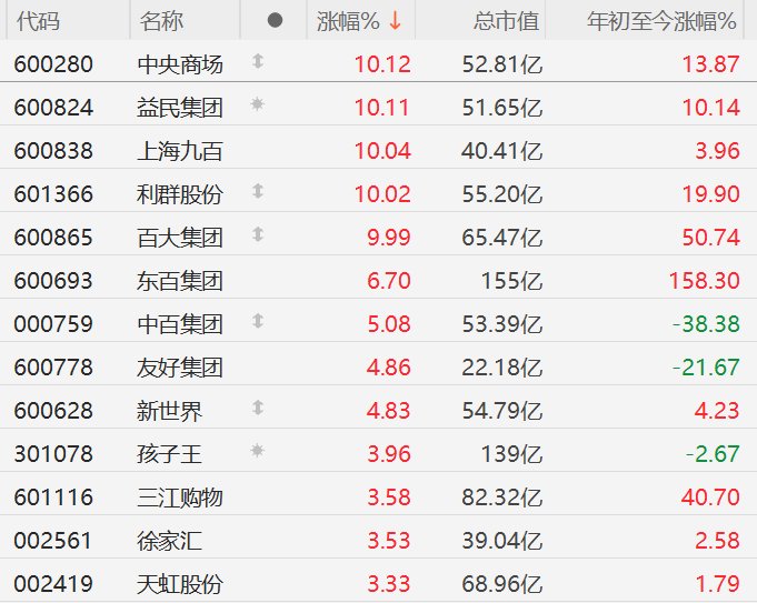 格隆汇12月18日|A股市场零售股拉升,其中,中央商场、益民集团、上海九百、利群股份、百大集团涨停,东百集团涨超6%,中百集团(维权)涨5%,友好集团、新世界涨超4%,孩子王、三江购物、徐家汇、天虹股份涨超3%。