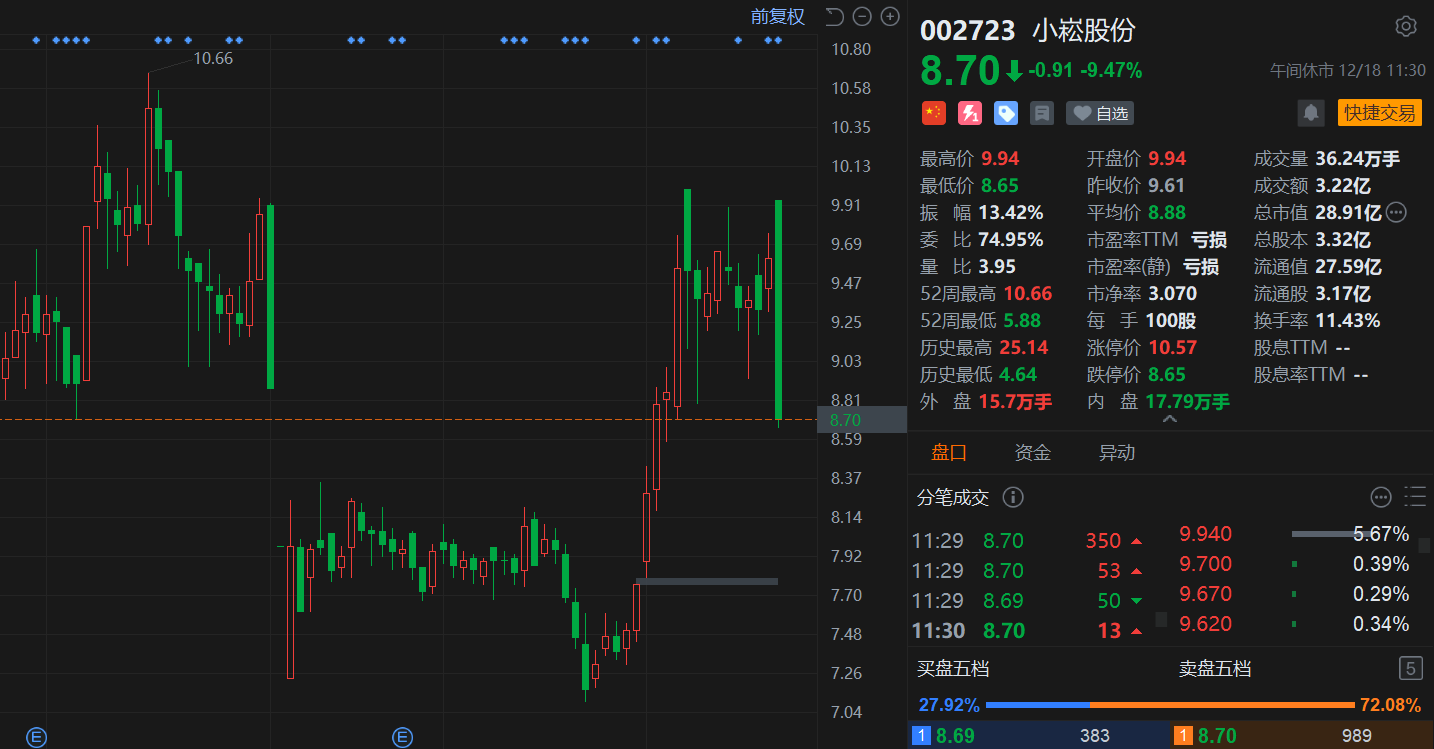 格隆汇12月18日|小崧股份(002723.SZ)呈现高开低走行情,午间大幅收跌9.47%,报8.7元,市值不足30亿元。消息上,短剧公司老板强势进驻A股市场,拿下一家上市公司。小崧股份12月17日晚间披露,其控股股东华欣创力与上海嘉晟时代企业管理合伙企业(有限合伙)(下称“嘉晟时代”)签署了《股份转让协议》。华欣创力拟向嘉晟时代协议转让其持有的小崧股份3073.79万股股份(占公司总股本的9.25%)。上述股份转让项下标的股份的转让价格为9.32元/股,股权转让价款总额为2.86亿元。