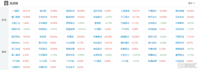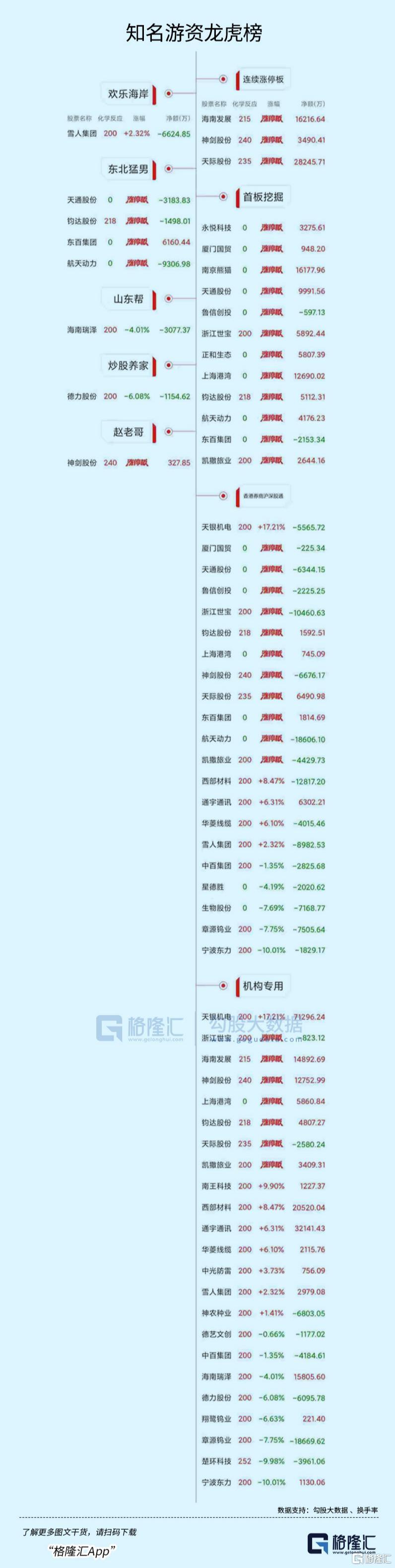 高位股方面,胜通能源9连板,嘉美包装9天7板,浙江世宝7天5板,神剑股份5连板,*ST亚振6天4板,海南发展4连板,环旭电子6天3板,华联控股、航天工程、国机精工4天3板。
