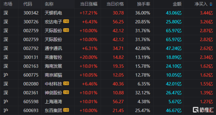 龙虎榜单日净买入额前三为天银机电、天际股份、通宇通讯,分别为3.44亿元、2.82亿元、2.62亿元。