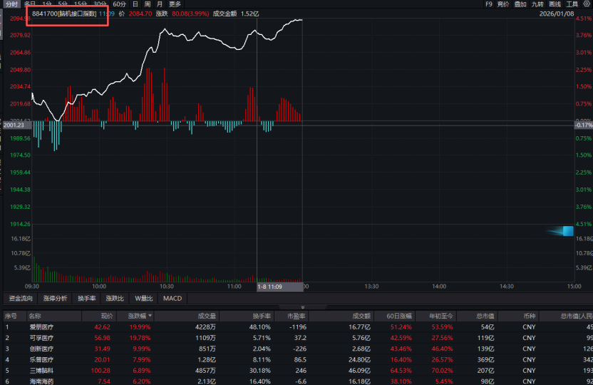 概念板块方面,今天上午脑机接口概念重新活跃,相关概念指数涨幅超过4%。