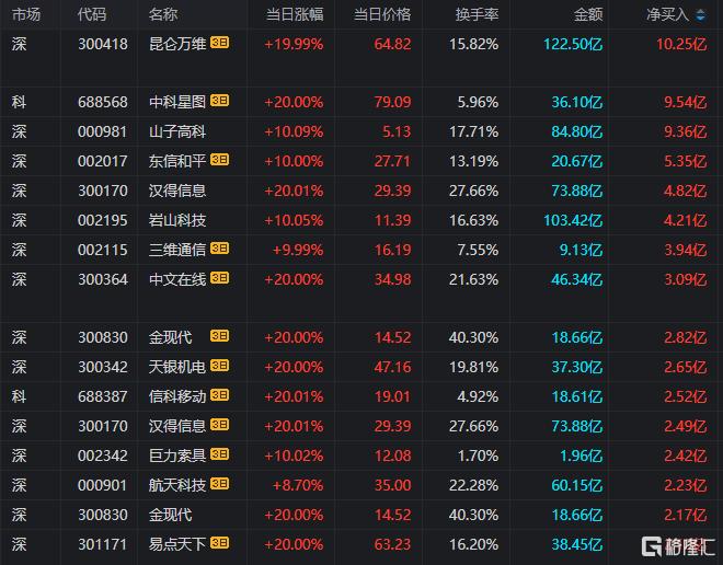 龙虎榜单日净买入额前三为山子高科、汉得信息、岩山科技,分别为9.36亿元、4.82亿元、4.21亿元。