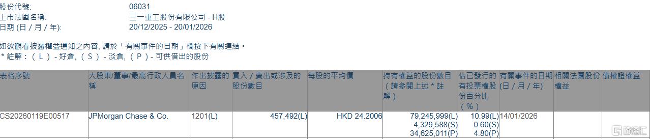 格隆汇1月20日丨根据联交所最新权益披露资料显示,2026年1月14日,三一重工(06031.HK)遭JPMorgan Chase & Co.以每股均价24.2006港元减持好仓45.75万股,涉资约1107.2万港元。