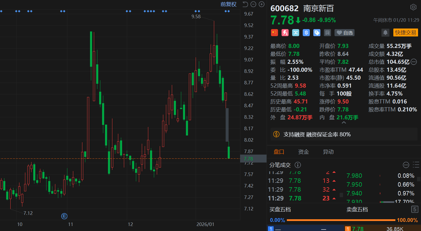 格隆汇1月20日|南京新百(维权)(600682.SH)跌停,报7.78元,近几日走出大涨大跌的“A杀”行情,总市值104.65亿元。