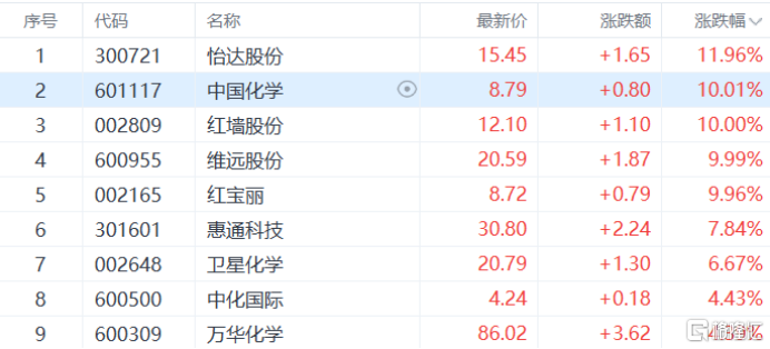 环氧丙烷板块强势,中国化学、红宝丽等多股涨停,惠通科技涨超7%,卫星化学、中化国际等多股跟涨。
