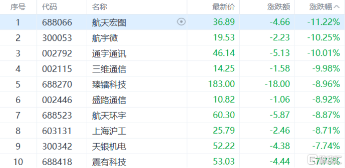 商业航天、卫星互联网板块下跌,通宇通讯、三维通信、航天动力等多股跌停,航天宏图跌超11%,盛路通信、上海沪工、天银机电等多股跟跌。