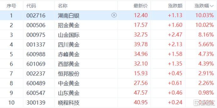 贵金属板块走强,湖南白银、招金黄金双双涨停,山金国际涨超8%,四川黄金涨超5%,赤峰黄金、西部黄金等多股跟涨。