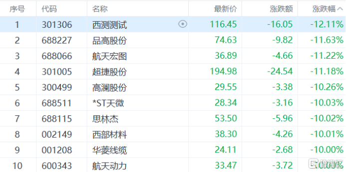 军工板块走弱,神剑股份等多股跌停,西测测试跌超12%,品高股份、航天宏图等多股跟跌。
