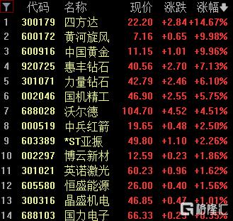 培育钻石板块继续上攻,黄河旋风、中国黄金涨停,四方达涨超14%,惠丰钻石涨超7%。