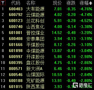 煤炭开采加工板块下跌,大有能源、云煤能源、兰花科跌超4%,晋控煤业、安泰集团、山西焦化跌超3%。