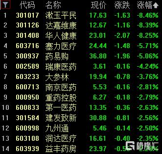 医药商业板块下跌,漱玉平民、达嘉维康、华人健康跌超8%,塞力医疗(维权)、药易购跌超5%。