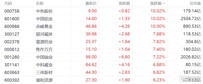 稀土永磁概念股走强,中色股份、中国铝业涨停。银河磁体、章源钨业、焦作万方涨超7%。消息面上,近期政策释放长期利好,商务部明确“便利合规稀土磁体出口”,工信部修订稀土管理条例强化开采配额管理。同时,2025年12月31日缅甸克钦邦宣布全面停止稀土矿开采,国内中重稀土供给收缩,行业景气度提升。中信证券近日指出,全球稀土资源战略地位持续提升,稀土产业进入高质量发展新时代。