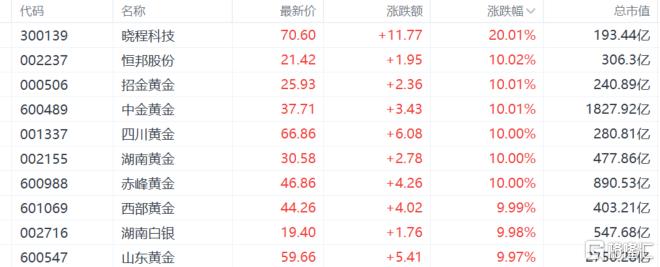 贵金属、黄金股大爆发,招金黄金、中金黄金、四川黄金、湖南黄金、赤峰黄金等多股涨停。消息面上,特朗普否认美元“跌过头”,暗示可以操控美元汇率,美元指数暴跌至近四年低点。今日现货黄金向上触及5270美元/盎司,日内涨近2%;纽约期金突破5300美元/盎司,日内涨3.53%。