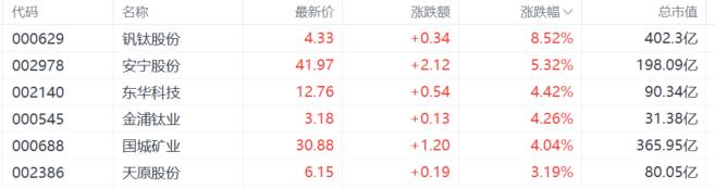 钛白粉概念股上涨,钒钛股份大涨超8%,安宁股份涨超5%,东华科技、金浦钛业等涨超4%。