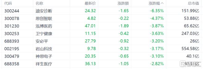 AI医疗概念跌幅居前,迪安诊断大跌超6%,思创智联(维权)跌超4%,泓博医药、卫宁健康跌超3%。