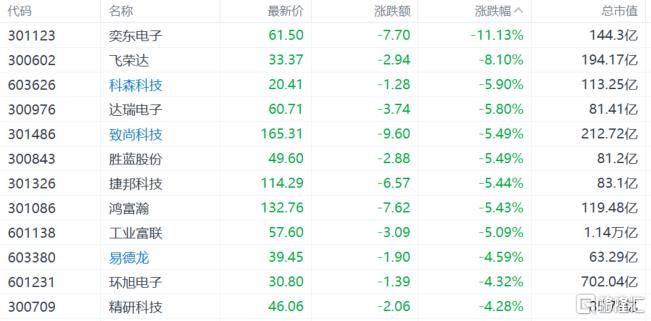 消费电子概念股走低,飞荣达跌超8%,工业富联跌超5%,环旭电子跌超4%。