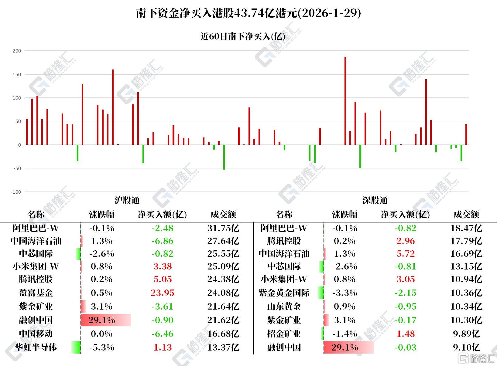 其中:净买入盈富基金23.95亿、腾讯控股8亿、小米集团-W 6.43亿、招金矿业1.48亿、华虹半导体1.13亿;净卖出中国移动6.45亿、紫金矿业3.77亿、阿里巴巴-W 3.3亿、紫金黄金国际2.15亿、中芯国际1.62亿、中国海洋石油1.13亿。