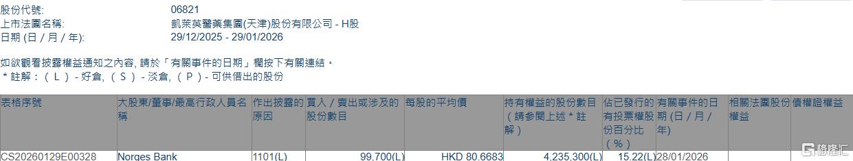 格隆汇1月29日丨根据联交所最新权益披露资料显示,2026年1月28日,凯莱英(06821.HK)获Norges Bank在场内以每股均价80.6683港元增持9.97万股,涉资约804.26万港元。