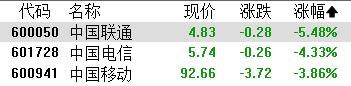 电信运营商低迷,中国联通跌超5%,中国电信、中国移动跟跌。