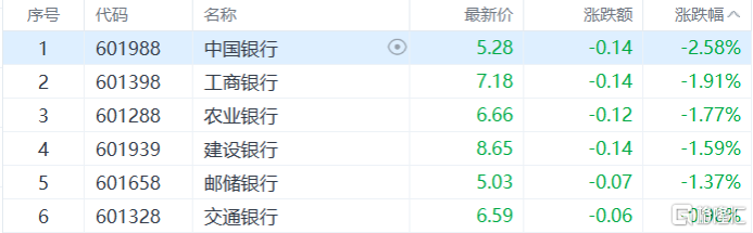 银行板块下跌,中国银行跌超2%,工商银行、农业银行、建设银行等多股跟跌。