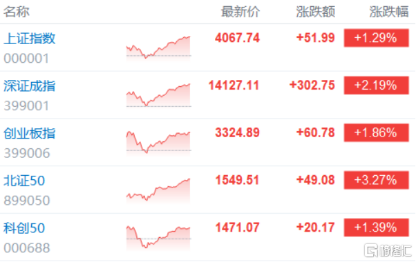 2月3日,A股三大指数早盘走低,午后集体走高;截至收盘,沪指涨1.29%报4067点,深证成指涨2.19%,创业板指涨1.86%,北证50指数涨3.27%。全市场成交额2.57万亿元,较前一交易日缩量410亿元,超4800股上涨。