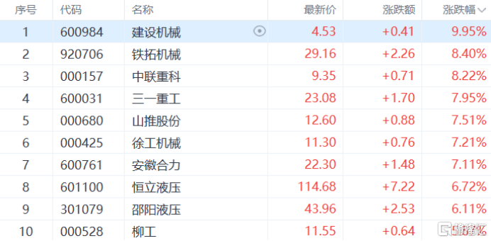 工程机械板块上涨,铁拓机械、中联重科涨超8%,三一重工、山推股份、徐工机械等多股跟涨。