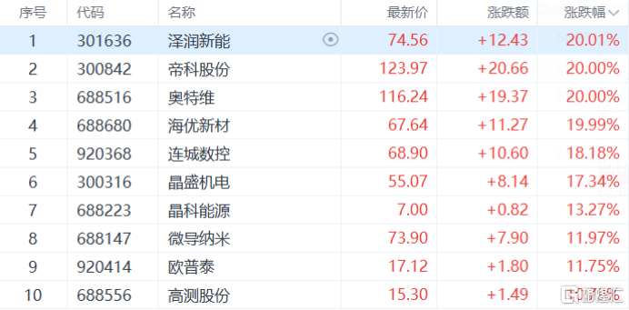 光伏设备板块走强,泽润新能、帝科股份等多股涨停,连城数控涨超18%,晶盛机电、微导纳米、欧普泰等多股跟涨。
