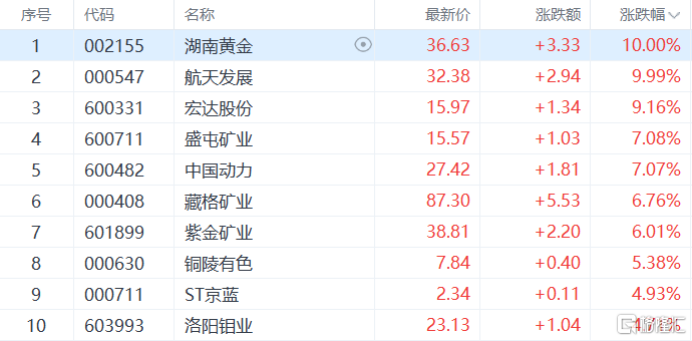 黄金股拉升,湖南黄金等多股涨停,盛屯矿业(维权)、中国动力涨超7%,藏格矿业、紫金矿业等多股跟涨。