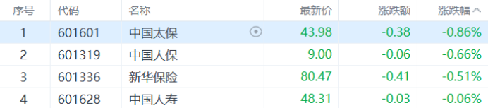 保险板块下挫,中国太保领跌,中国人保、新华保险、中国人寿等多股跟跌。