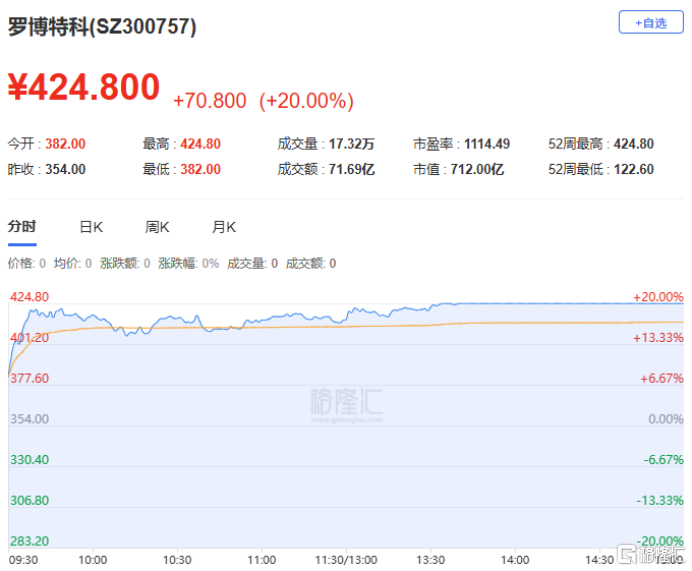 罗博特科涨停,报收424.8元。消息面上,当地时间周一,埃隆·马斯克旗下SpaceX在公司备忘录中确认与xAI合并,马斯克表示,此次收购旨在打造"地球内外最具雄心的垂直整合创新引擎"。