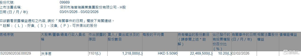 格隆汇2月3日丨根据联交所最新权益披露资料显示,2026年2月2日,海普瑞(09989.HK)获股东洪泽君在场内以每股均价5.509港元增持121.8万股,涉资约671万港元。