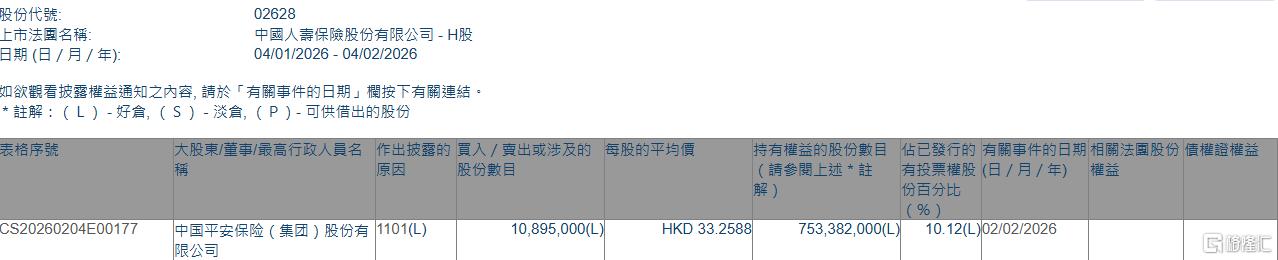 格隆汇2月4日丨根据联交所最新权益披露资料显示,2026年2月2日,中国人寿(02628.HK)获中国平安保险(集团)股份有限公司在场内以每股均价33.2588港元增持1089.5万股,涉资约3.62亿港元。
