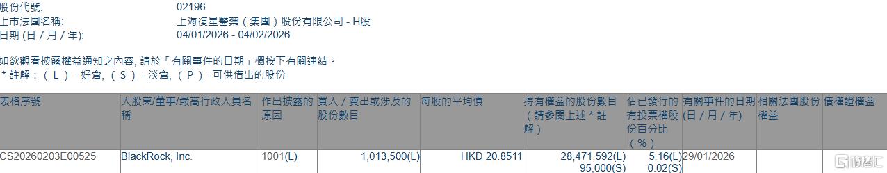 格隆汇2月4日丨根据联交所最新权益披露资料显示,2026年1月29日,复星医药(02196.HK)获BlackRock, Inc.在场内以每股均价20.8511港元增持好仓101.35万股,涉资约2113.26万港元。