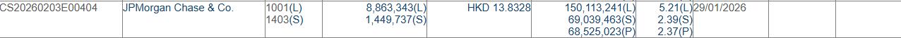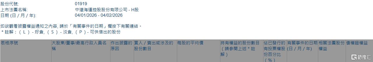 格隆汇2月4日丨根据联交所最新权益披露资料显示,2026年1月29日,中远海控(01919.HK)获JPMorgan Chase & Co.以每股均价13.8328港元增持好仓886.33万股,涉资约1.23亿港元。