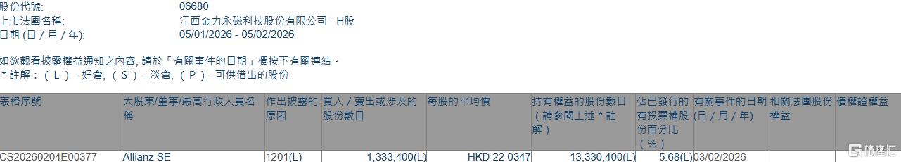 格隆汇2月5日丨根据联交所最新权益披露资料显示,2026年2月3日,金力永磁(06680.HK)遭Allianz SE在场内以每股均价22.0347港元减持133.34万股,涉资约2938.1万港元。