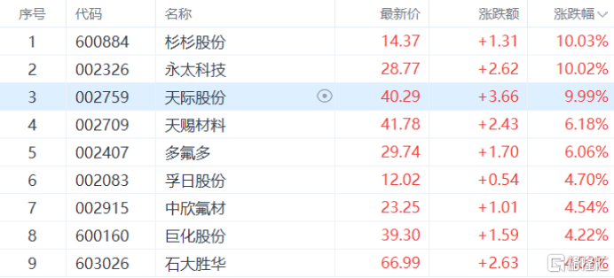 化工板块活跃,杉杉股份(维权)、永太科技、天际股份等多股涨停,天赐材料、多氟多涨超6%,孚日股份、中欣氟材等多股跟涨。