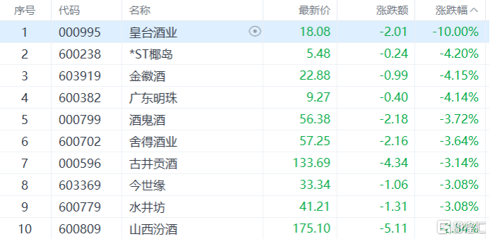 白酒板块下跌,皇台酒业跌停,金徽酒、广东明珠、酒鬼酒、舍得酒业等多股跟跌。