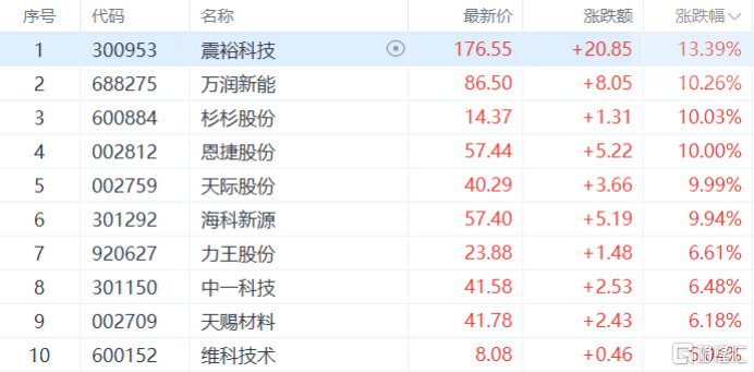 电池板块走强,万润新能、恩捷股份等多股涨停,震裕科技涨超13%,力王股份、中一科技、天赐材料等多股跟涨。