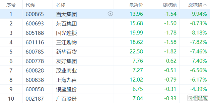 零售板块下挫,百大集团领跌,东百集团、国光连锁、三江购物等多股跟跌。