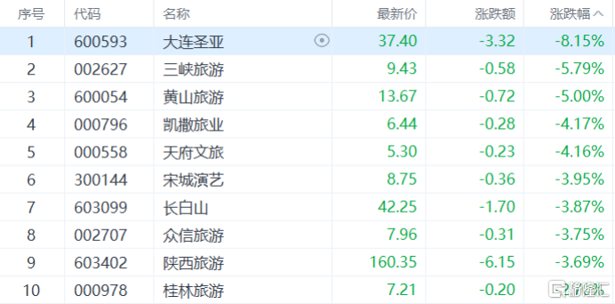 旅游及景区板块走弱,大连圣亚领跌,三峡旅游、黄山旅游、凯撒旅游等多股跟跌。