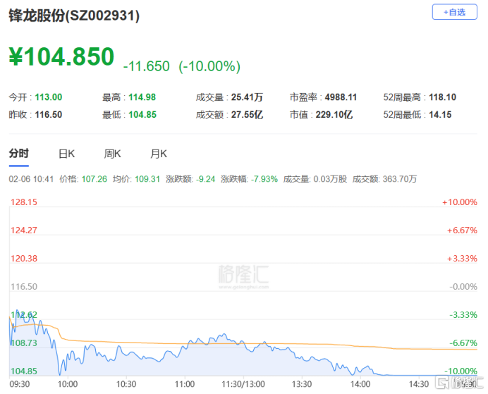 锋龙股份跌停,报104.85元。消息面上,2月6日盘前,锋龙股份发布股票交易异常波动暨风险提示公告。锋龙股份称,如未来公司股票价格进一步异常上涨,公司可能再次向深圳证券交易所申请停牌核查。敬请广大投资者理性投资,注意投资风险。