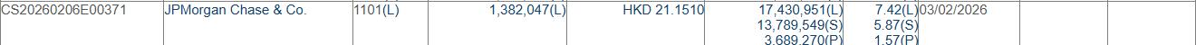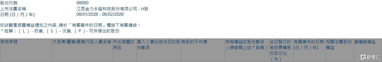 格隆汇2月6日丨根据联交所最新权益披露资料显示,2026年2月3日,金力永磁(06680.HK)获JPMorgan Chase & Co.以每股均价21.151港元增持好仓138.20万股,涉资约2923.2万港元。