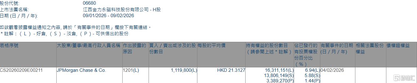 格隆汇2月9日丨根据联交所最新权益披露资料显示,2026年2月4日,金力永磁(06680.HK)遭JPMorgan Chase & Co.以每股均价21.3127港元减持好仓111.98万股,涉资约2386.6万港元。