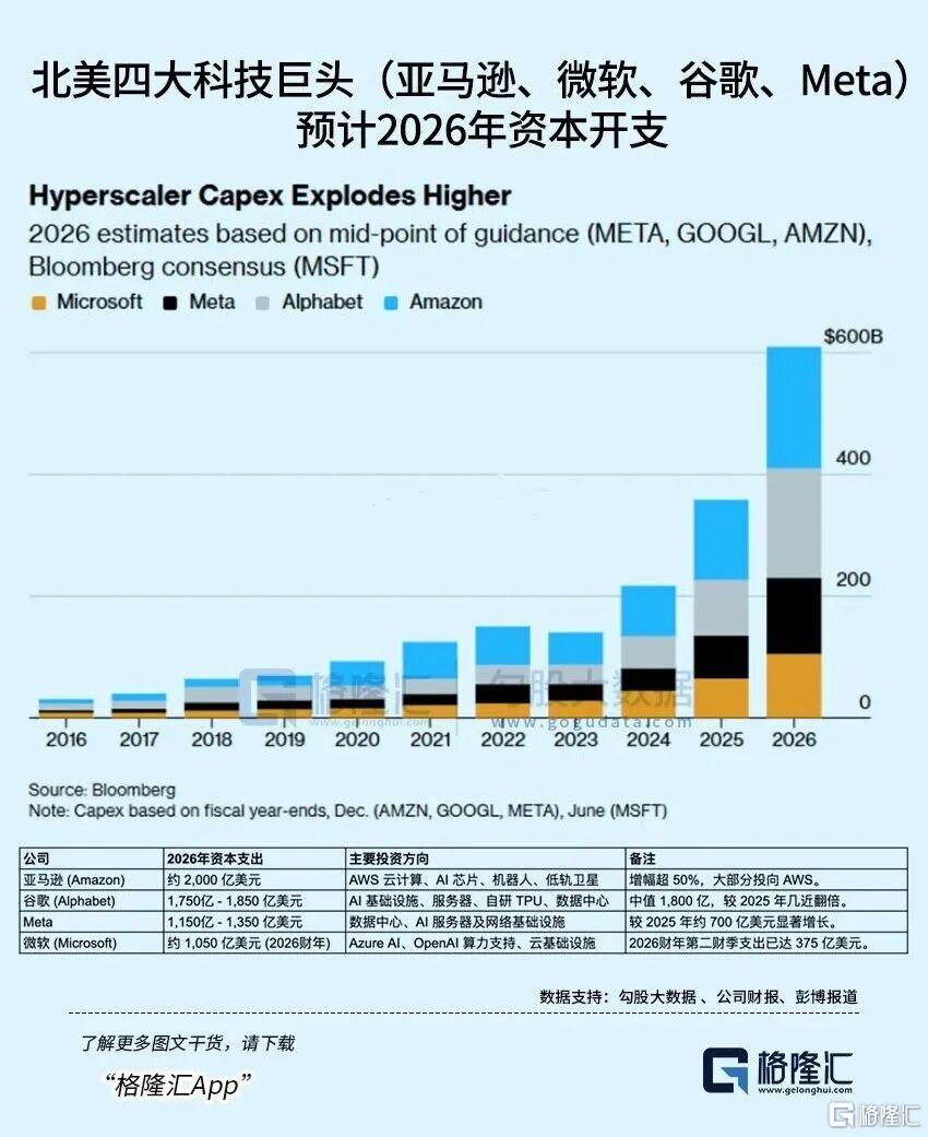 同时以英伟达链为代表的算力硬件需求日盈增加,据PB社报道,最新财报显示,谷歌、亚马逊、Meta、微软四大科技巨头预计2026年资本开支合计将达约6500亿美元(环比增长60%以上),部分公司投入超过过去三年总和,主要砸向AI数据中心与相关设备,AI基建狂潮方兴未艾,关键是服务器产能和IDC数据中心建设跟不上需求。