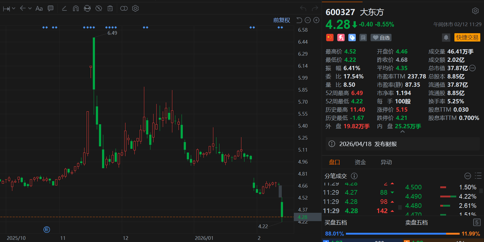 大东方(600327.SH)跌8.55%,低见4.22元刷新阶段新低,总市值37.9亿元。消息上,大东方昨日晚发布公告,公司及财务总监徐文武因违规行为,被采取出具警示函措施。经查,公司对参股合伙企业的投资作为长期股权投资核算依据不充分,会计处理不审慎,且未识别出参股合伙企业会计处理不当,未充分关注到参股合伙企业底层资产经营情况对公司财务报表的影响,导致公司2022年至2024年财务报表相关财务数据披露不准确。该行为违反了相关规定。此外,公司去年净利预计盈转亏。