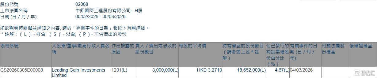 格隆汇3月5日丨根据联交所最新权益披露资料显示,2026年3月4日,中铝国际(02068.HK)遭Leading Gain Investments Limited在场内以每股均价3.271港元减持300万股,涉资约981.3万港元。