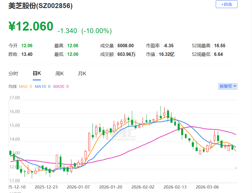 格隆汇3月18日|美芝股份(002856.SZ)一字跌停,报12.06元刷新阶段新低,总市值不足20亿元。消息上,美芝股份昨日晚间发布《2025年度业绩预告修正公告》,公告显示,公司预计2025年归母净利润为-1.98亿元至-1.32亿元,此前预计为-1.125亿元至-7500万元;预计扣非后净利润为-2.14亿元至-1.48亿元,此前预计为-9582.37万元至-5832.37万元。公司同日发布了《关于公司股票交易可能被实施退市风险警示的提示性公告》,若公司2025年度期末归属于母公司所有者权益为负值,公司股票交易将在2025年年度报告披露后被深圳证券交易所实施退市风险警示(股票简称前冠以“*ST”字样)。
