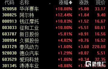 摩托车概念走高,华洋赛车涨超18%,阿尔特涨超12%,钱江摩托、征和工业10cm涨停,新日股份、春风动力等跟涨。