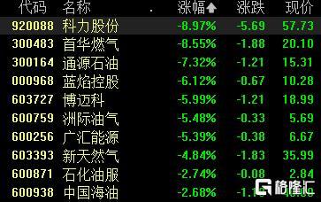 油气股大跌,科力股份、首华燃气跌超8%,通源石油跌超7%,蓝焰控股、博迈科、洲际油气等跟跌。