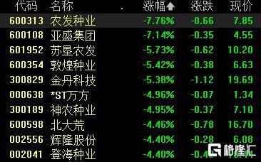 粮食、种业股走低,农发种业、亚盛集团跌超7%,苏垦农发、敦煌种业、金丹科技跌超5%,神农种业、北大荒等跟跌。